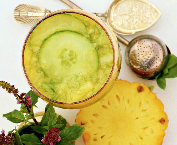 Pour a cup of boiling water over the fresh basil leaves. Let it stand for three minutes, strain it, and pour it into a glass. Stand this in a bowl and tuck ice around it. While it cools, blend six thin slices of unpeeled cucumber and two thick slices of peeled pineapple in a liquidizer.